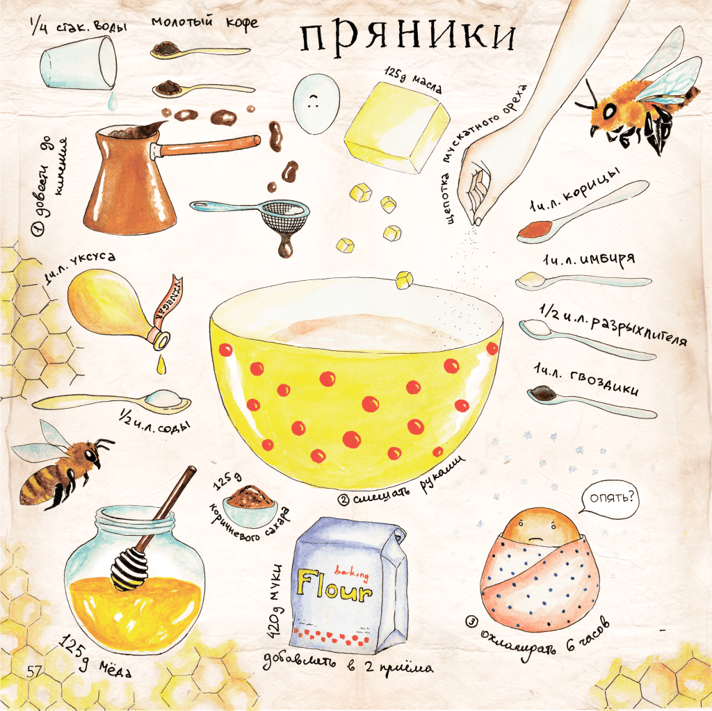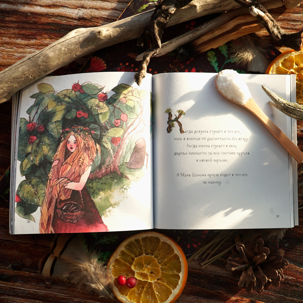 The second book in the Mama Shamana trilogy. Consists of 80 pages, 16 brand new fairy tales and 16 recipes, each of which fits its story like a button to its loop. The illustrations for the book were drawn by Anastasia Stepanova, and the recipes were drawn by the author herself. The book also has a table of measures and weights so that you do not get confused in grams, glasses and milliliters.