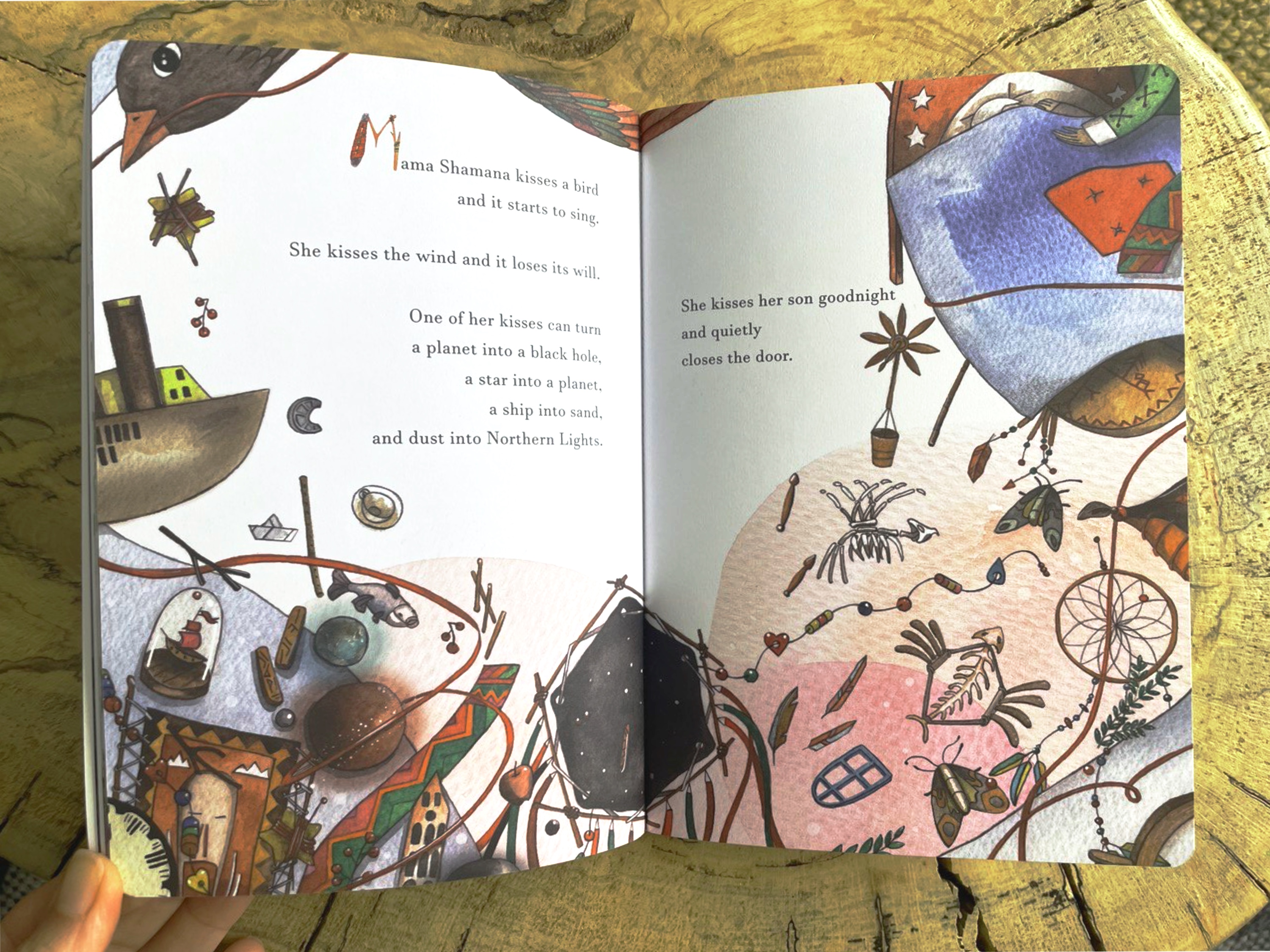 “Mama Shamana kisses a bird and it starts to sing. She kisses the wind and it loses its will. One of her kisses can turn a planet into a black hole, a star into a planet, a ship into sand, and dust into Northern Lights.