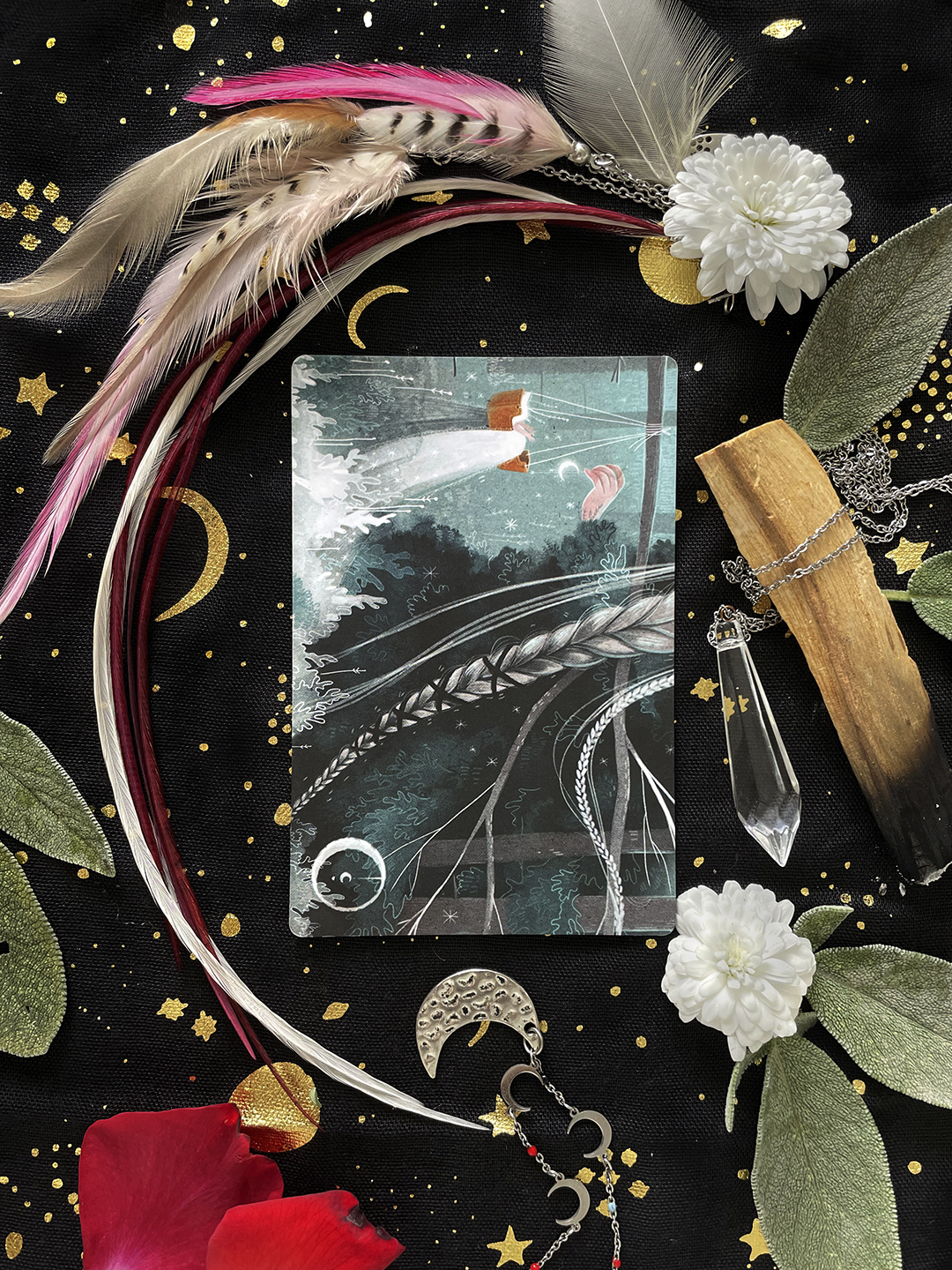 The cards are illustrated by the Latvian artist Diana Renjina. The set contains 40 full-color cards, a guide book and bag with silver print.